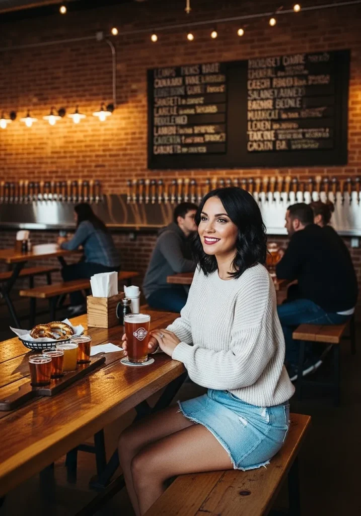 A light knit sweater and denim skirt combo is the perfect cute brewery outfit that’s both comfortable and chic. This outfit is ideal for a more relaxed brewery setting where you want to keep things casual but still look put-together. The light sweater adds a cozy feel, while the denim skirt keeps things youthful and fun. Whether you’re at a cozy indoor brewery or enjoying the cool weather on a brewery patio, this outfit is perfect for sipping on craft beers.