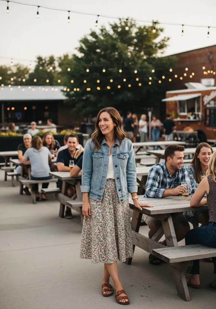 For footwear, sandals are a great option, particularly tan or neutral-colored ones that keep the focus on the jacket and skirt combination. You can also swap the sandals for white sneakers if you prefer a more casual and sporty look. This outfit is both comfortable and polished, making it perfect for a casual brewery date or hanging out with friends at a pub. The denim jacket provides just the right amount of coverage, while the skirt keeps things light and breezy for a summer brewery outing.