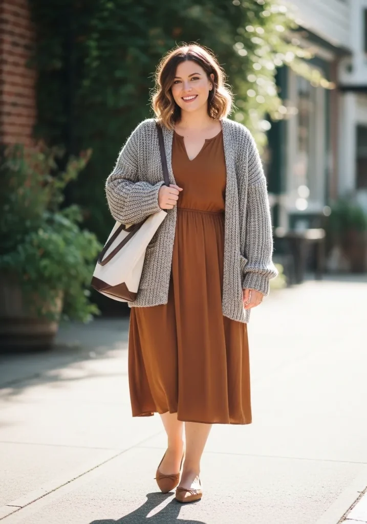 Layering a cardigan over a midi dress creates a cozy yet classy outfit. The cardigan softens the look while still maintaining elegance and structure.