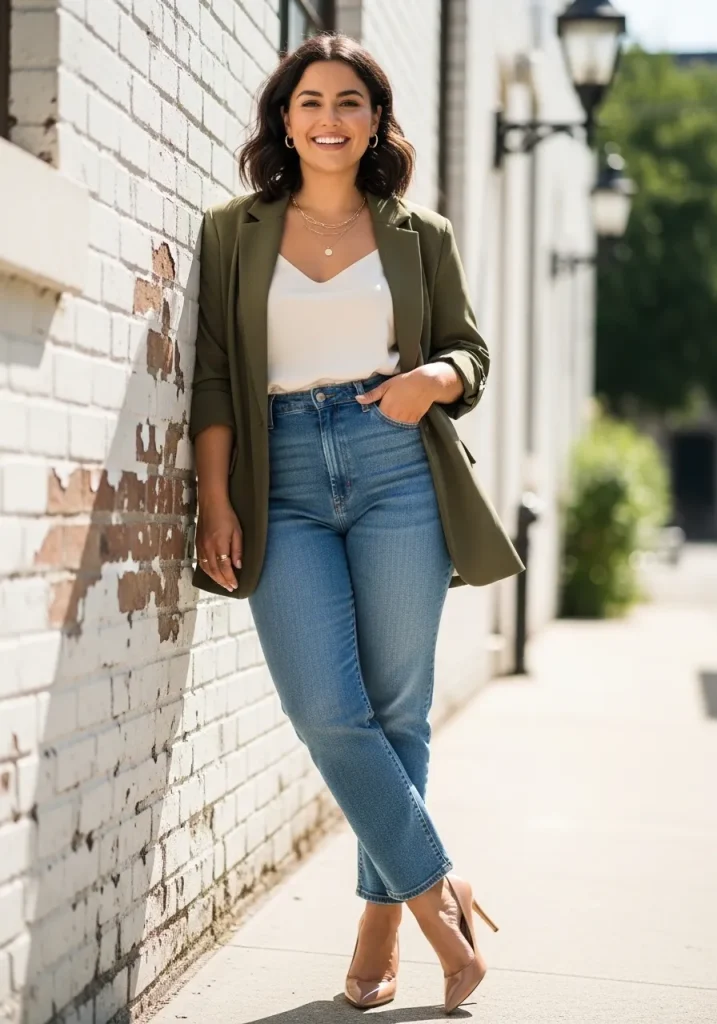 High-waisted jeans paired with a blazer create a perfect mix of casual and classy. The jeans keep the look relaxed, while the blazer adds structure and sophistication.