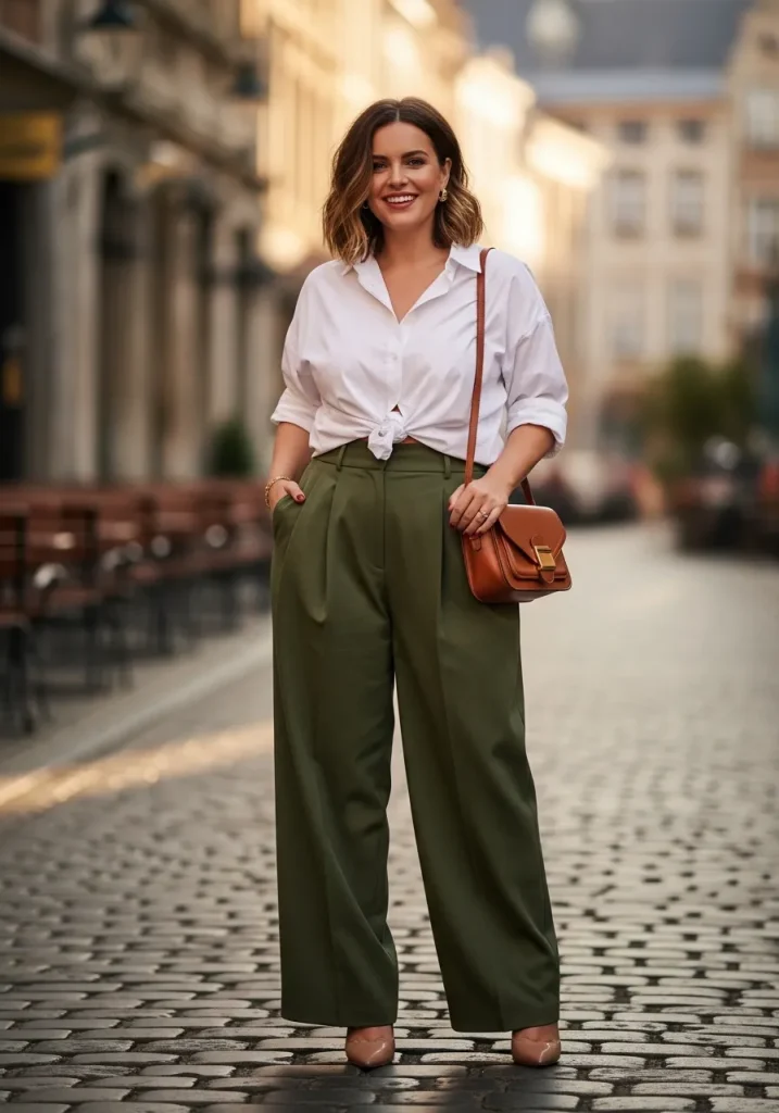 A crisp white shirt paired with high-waisted pants creates a clean and timeless outfit that always looks polished. The structured shirt adds sharpness, while the high-waisted pants enhance your silhouette.