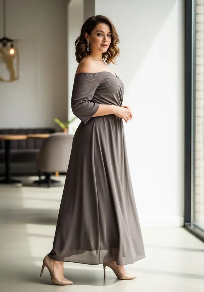 An off-shoulder dress adds a soft and feminine touch while still looking elegant. The neckline creates a delicate and slightly romantic feel.