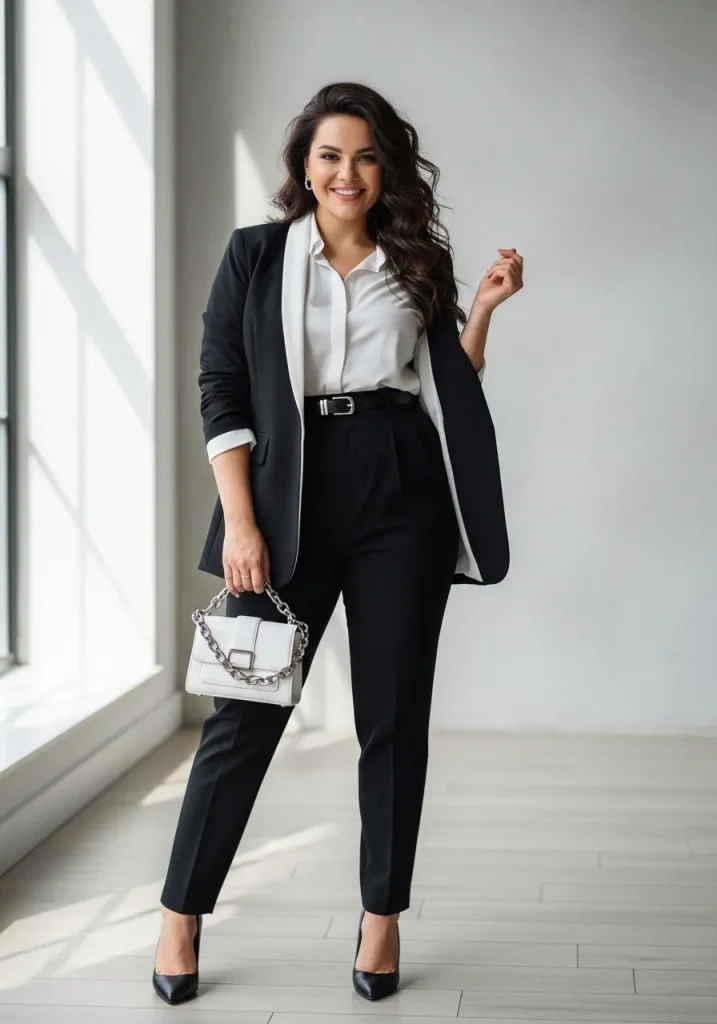 You can mix pieces like black trousers with a white blouse or vice versa. Pair with heels or loafers for a clean finish. This outfit works for almost any occasion.