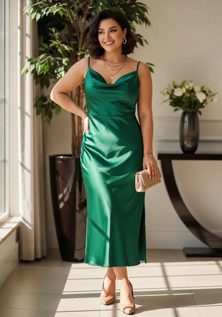A satin midi dress brings an instant touch of luxury to your wardrobe. The soft sheen of the fabric reflects light beautifully, making the outfit feel rich and sophisticated without being overly flashy.