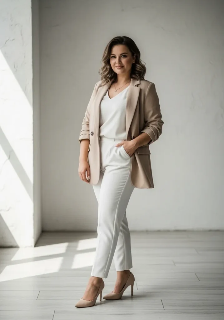 A beige blazer paired with white pants creates a fresh, light, and ultra-classy look. The combination feels clean and elevated, especially for spring and summer styling.