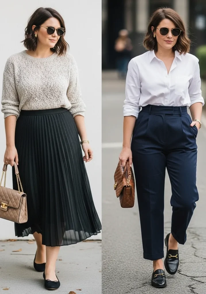 A pencil skirt paired with a silk blouse creates a sophisticated and feminine outfit that feels timeless. The fitted skirt defines your shape while the blouse adds softness and elegance.