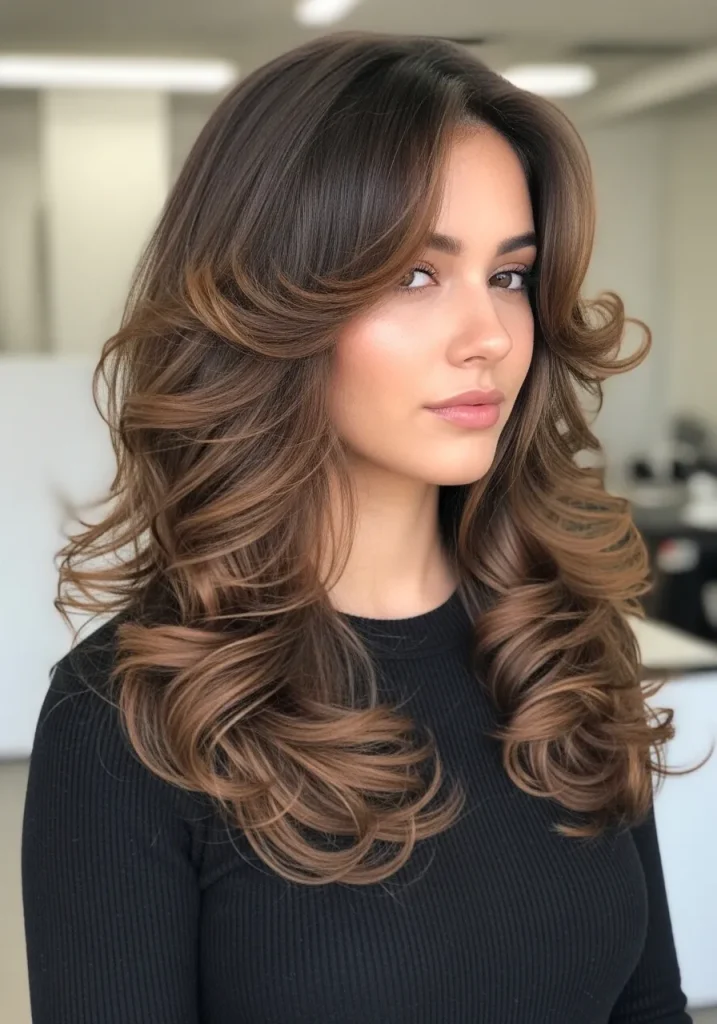 Adding volume at the crown is one of the easiest ways to balance a round face shape. This style lifts the hair upward, creating a vertical illusion that makes your face appear longer. The layered curls enhance the movement while keeping the overall look light and airy.