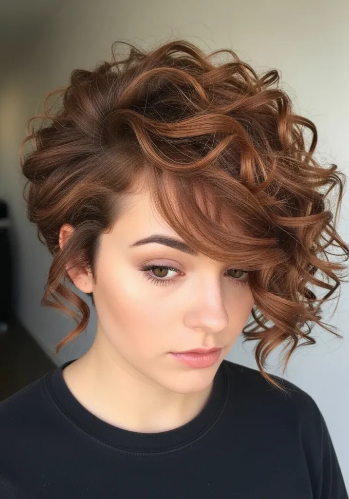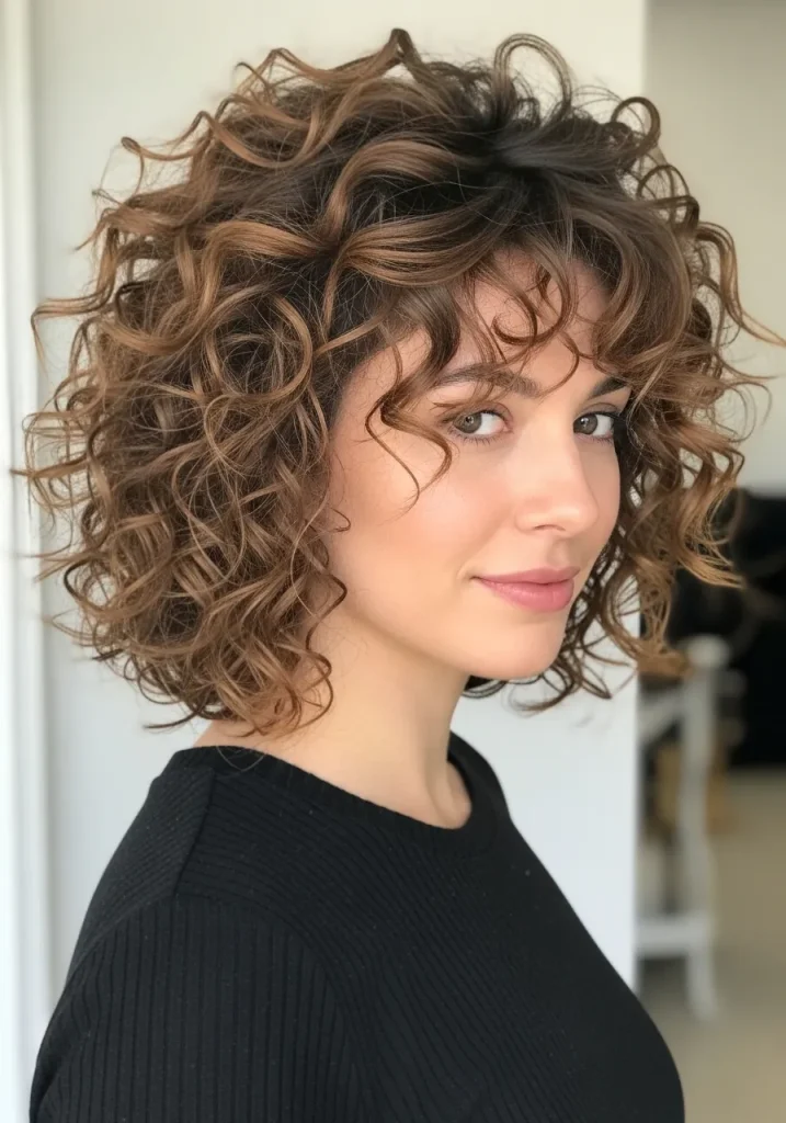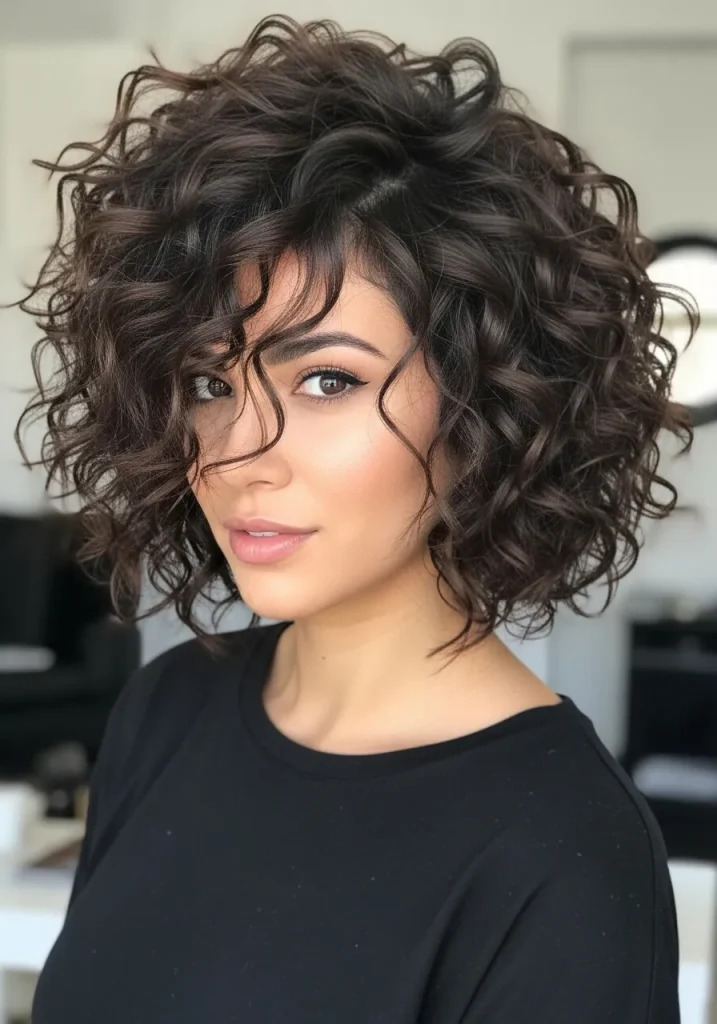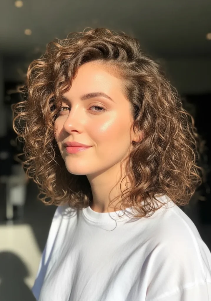An angled curly bob is a stylish and modern option that works beautifully for round faces. The longer front pieces create a vertical line that helps elongate the face, while the shorter back adds volume and structure.
