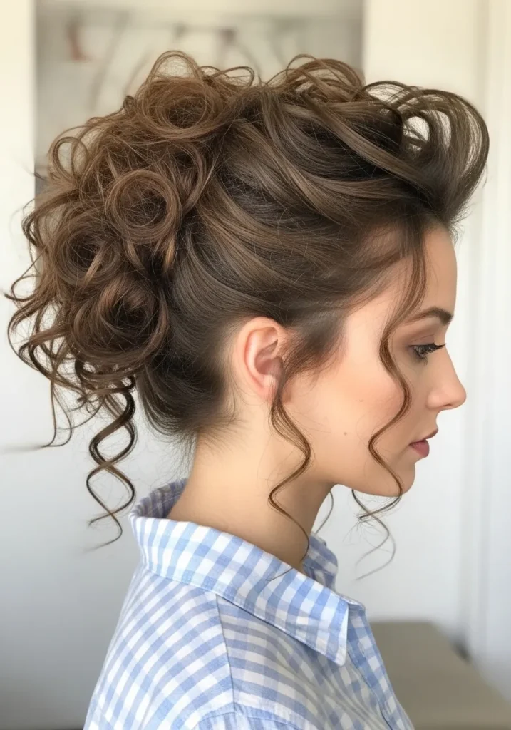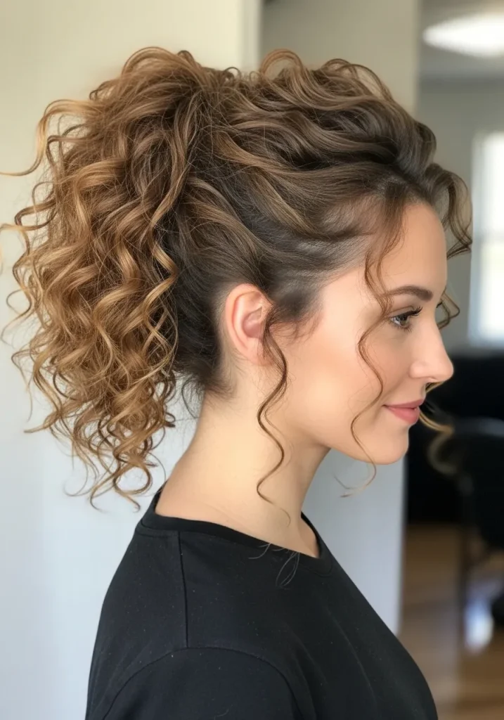 You can position the ponytail high or mid-level depending on your preference. Smooth the front slightly while keeping the curls full and bouncy. This hairstyle is both practical and stylish, making it ideal for everyday wear or active days.