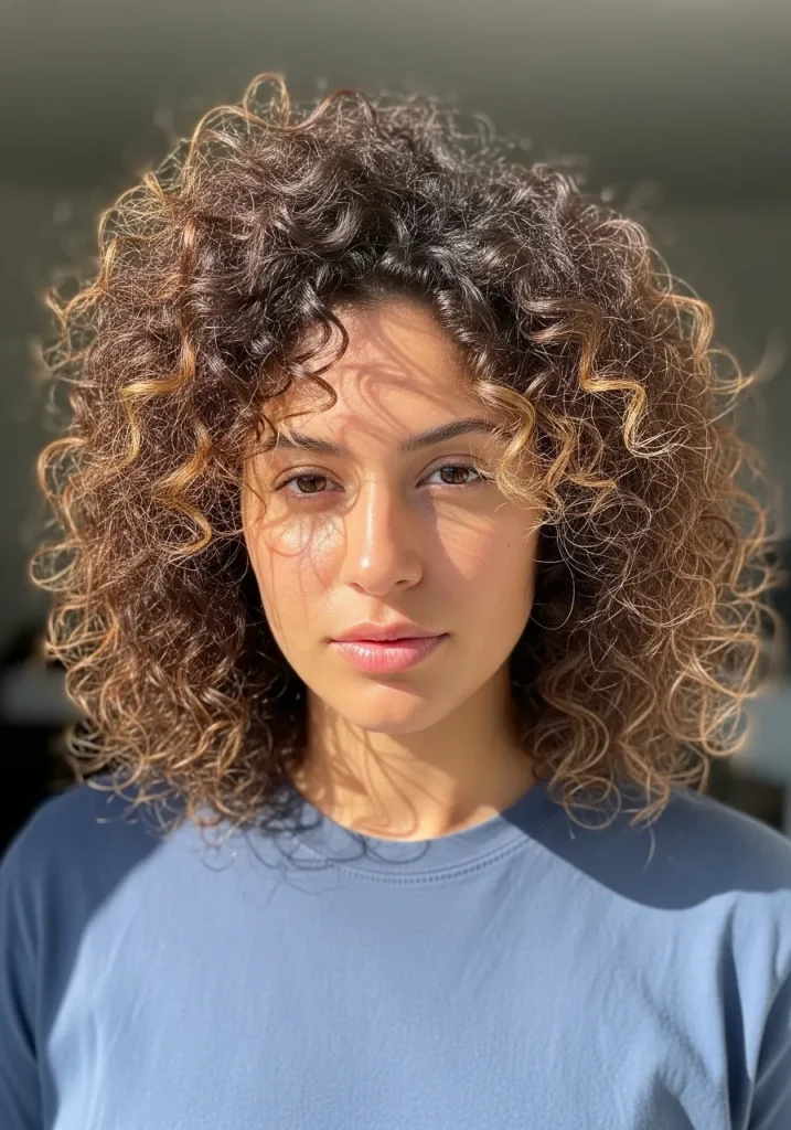 Layers combined with subtle highlights add dimension and depth to curly hair, making it a perfect choice for round faces. The variation in color draws the eye vertically, helping to elongate the face while enhancing the natural curl pattern.
