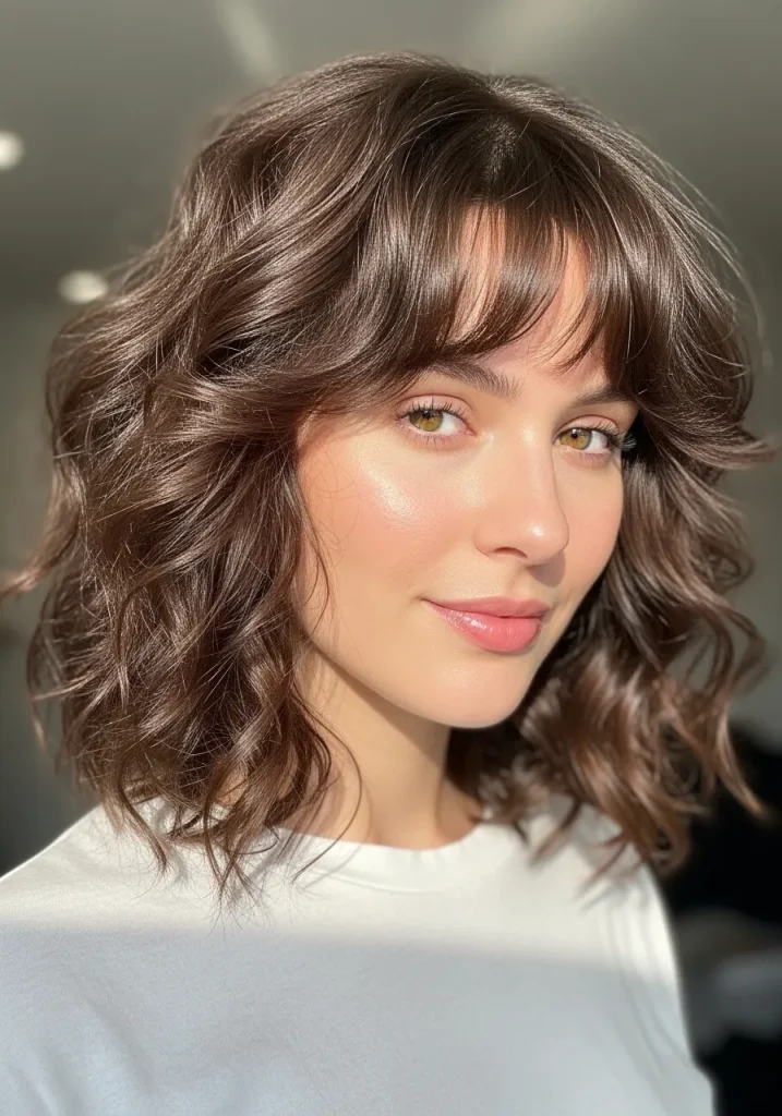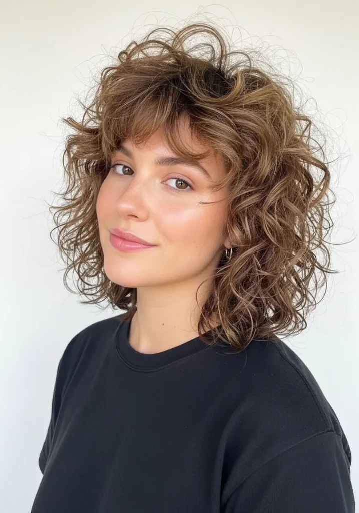 Shoulder-Length Curls with Curtain Bangs