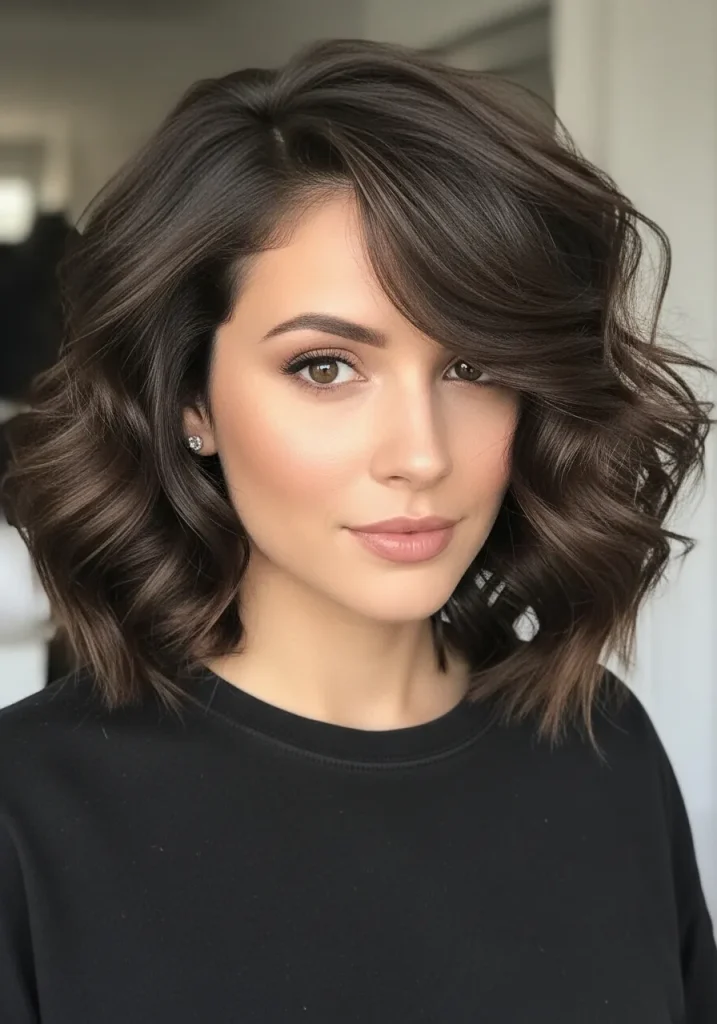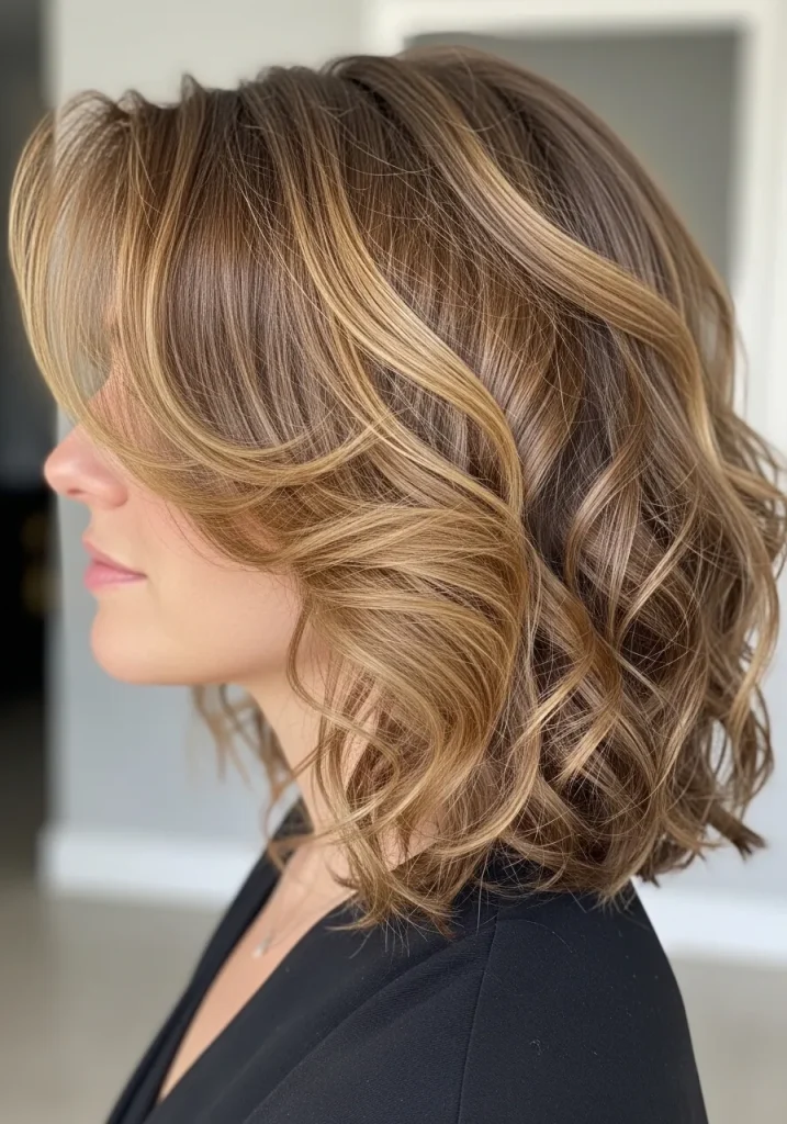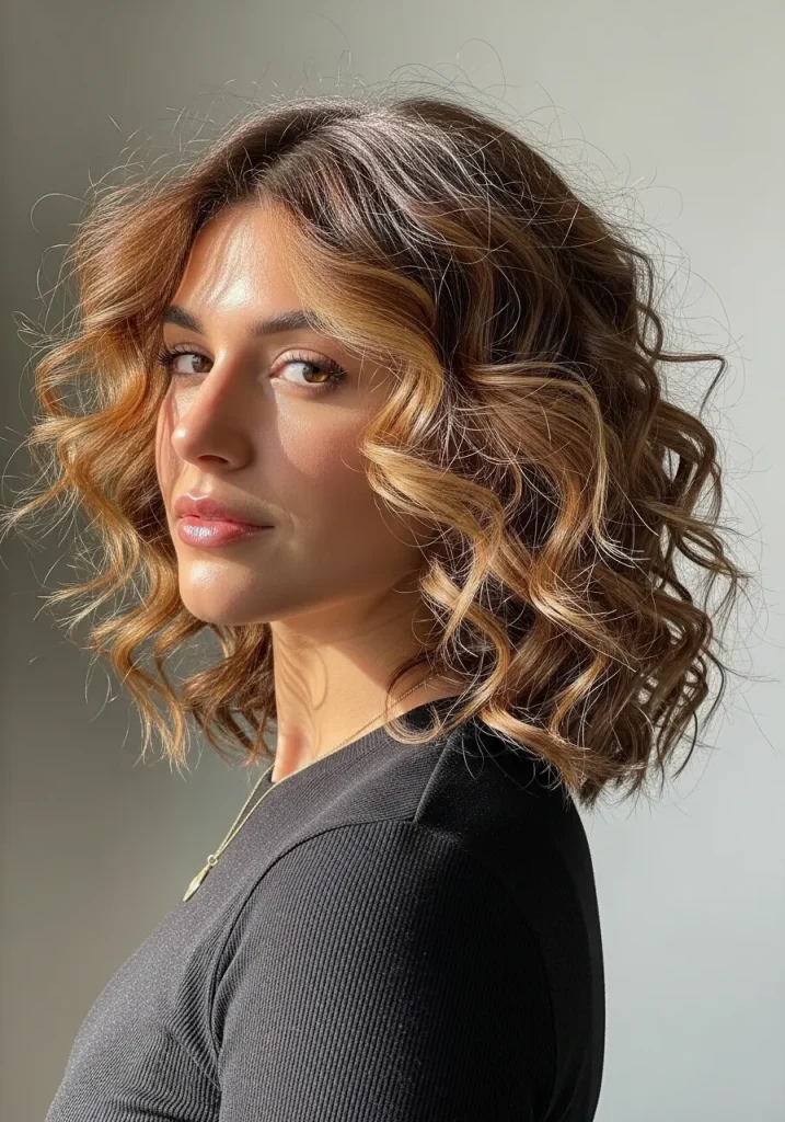 A curly lob with a deep side part instantly adds drama and volume to your medium-length hair. The deep part creates a sweeping effect that lifts the roots and gives your curls a fuller, more glamorous appearance. It’s a simple styling trick that makes a noticeable difference.