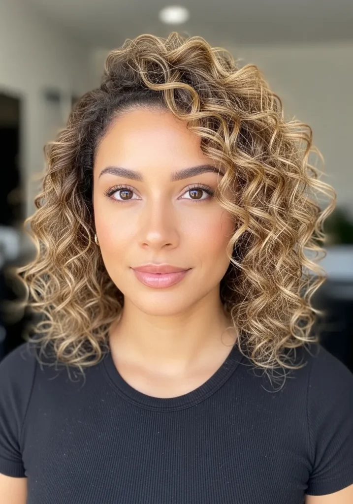 Adding highlights to medium-length curly hair brings dimension and brightness to your overall look. The lighter tones catch the light beautifully, enhancing the natural shape and movement of your curls.
