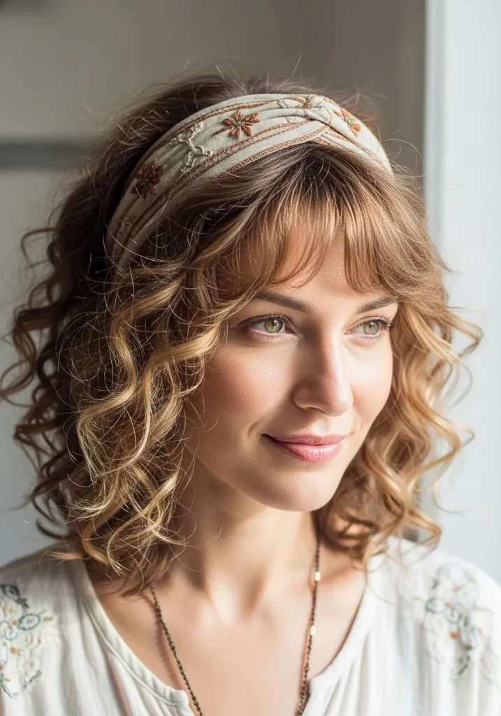 A headband style adds a cute and feminine touch to medium-length curly hair. It keeps your curls in place while adding a stylish accessory that can completely elevate your look.