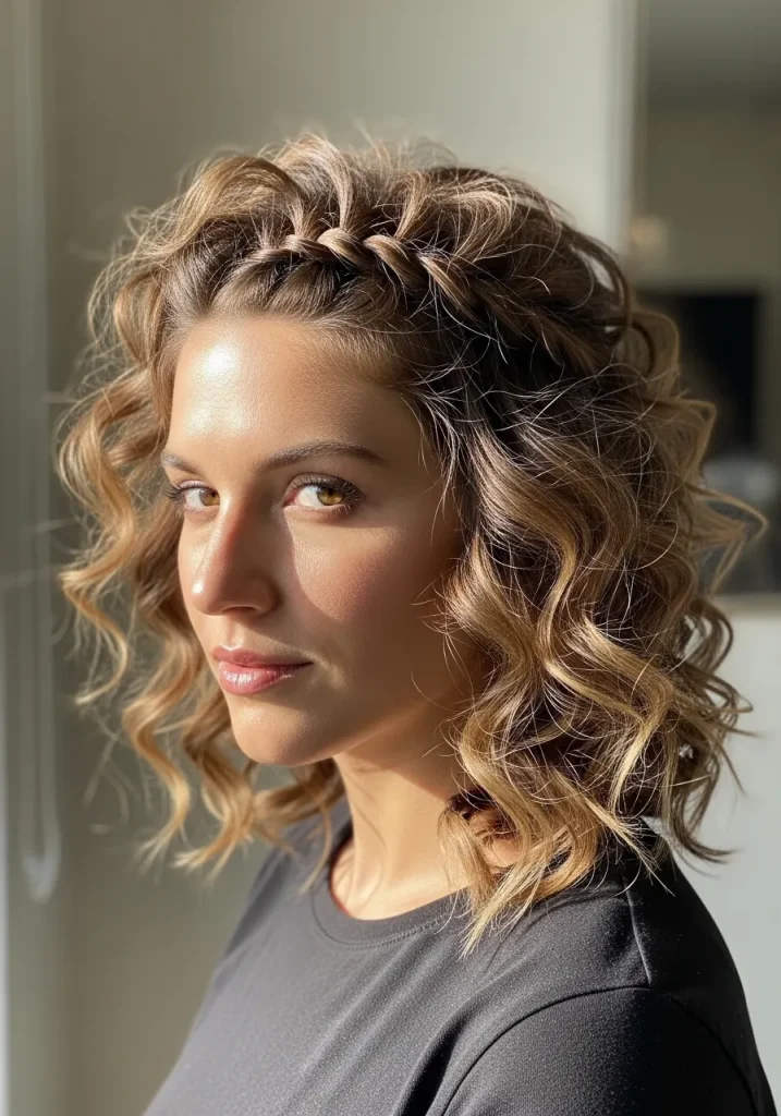 Adding a braided front detail to medium-length curly hair gives your hairstyle a unique and stylish twist. The braid keeps the front section neat while allowing the rest of your curls to flow freely.