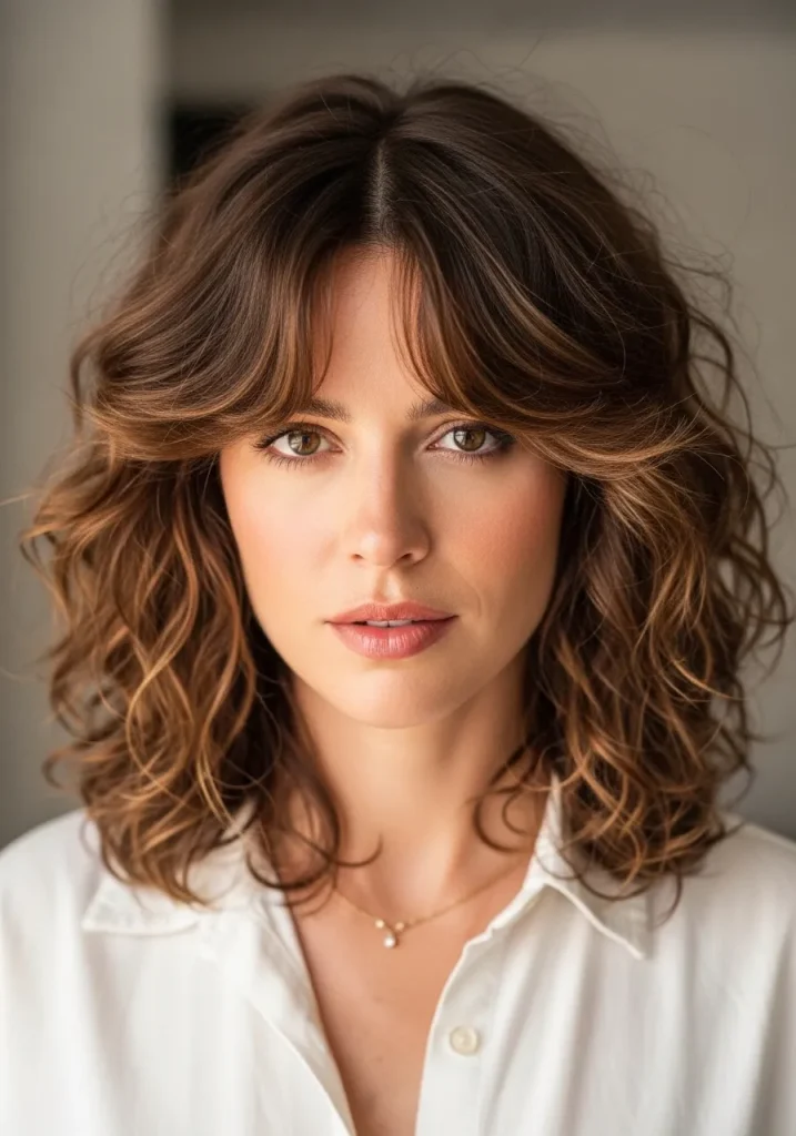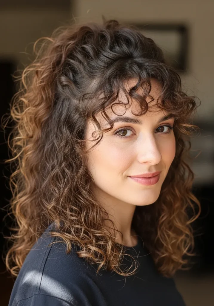 Curtain bangs add a soft, trendy touch to medium-length curly hairstyles. They blend seamlessly into the rest of the curls, creating a face-framing effect that feels both modern and flattering.