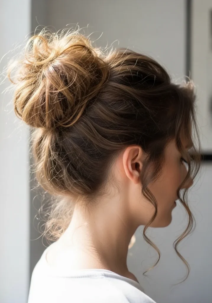 Messy Curly Bun with Loose Strands