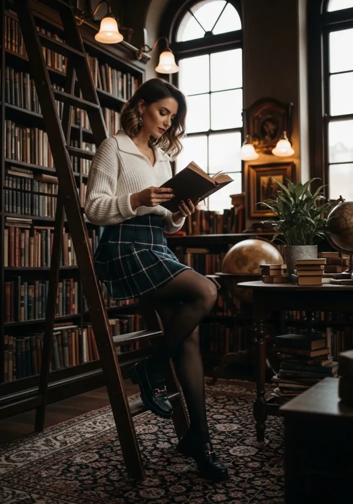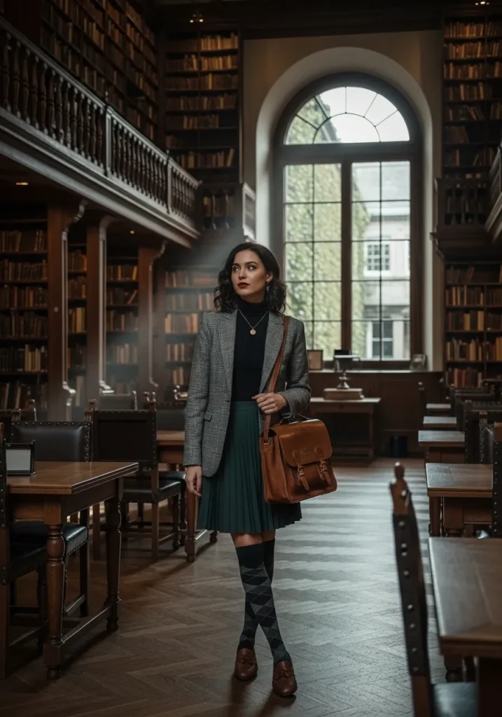 Complete the outfit with knee-high socks, loafers, and a vintage-inspired leather satchel for a truly academic finish. You can also add subtle gold jewelry or round glasses to make the styling feel even more intentional. This outfit works beautifully for campus days, bookstore visits, or quiet café afternoons where you want to look polished and thoughtful. It is classic, intellectual, and effortlessly photogenic in that moody Pinterest way.