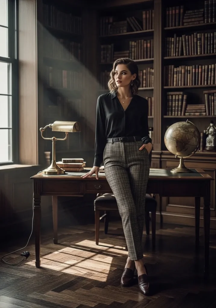 A black blouse paired with tweed trousers and heeled loafers creates a dark academia outfit that feels mature, polished, and slightly dramatic. The blouse gives the outfit a sleek and elegant base, while the tweed trousers bring texture and that heritage-inspired academic character. Heeled loafers elevate the look just enough to make it suitable for dressier occasions without losing the vintage mood. Deep neutral tones help keep everything sophisticated and balanced.