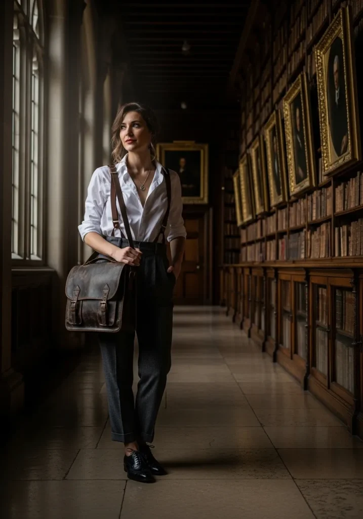 An oxford shirt styled with suspenders and tailored trousers gives dark academia a more androgynous and vintage-inspired feel. The crisp shirt brings structure and intelligence to the outfit, while the suspenders add character and a distinctly old-school scholarly charm. Tailored trousers in charcoal, camel, black, or brown keep the look sharp and intentional. This outfit is especially great for those who want something classic, understated, and a little more unique.