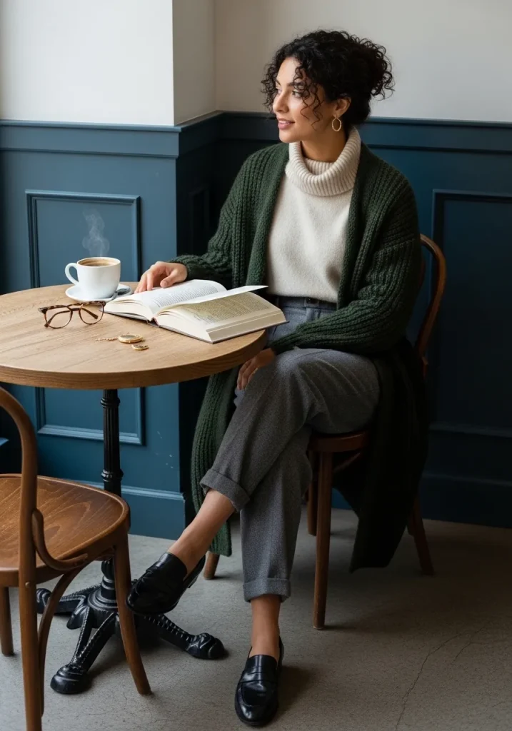 Loafers make the outfit feel classic and grounded, especially when styled with visible socks or a neat leather belt. You can carry a satchel or book tote to complete the scholarly look and keep the styling practical. This outfit is great for study sessions, library days, or a relaxed lunch in a quiet café. It feels timeless, put together, and full of cozy academic energy.