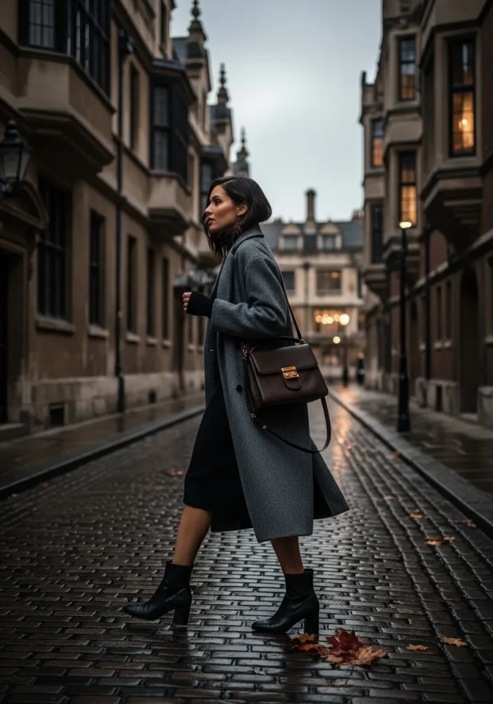 Pair it with a silk blouse, fine jewelry, or a leather clutch to enhance the sophisticated mood without making it too formal. Heeled boots add height and confidence, helping the entire outfit feel stronger and more refined. This look is especially fitting for poetry readings, concerts, or stylish autumn evenings out. It feels dramatic, elegant, and undeniably memorable.
