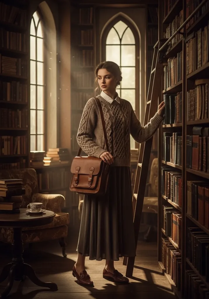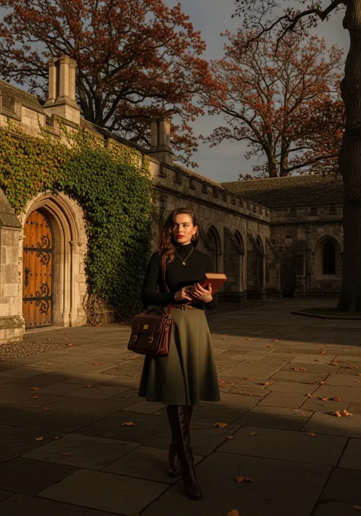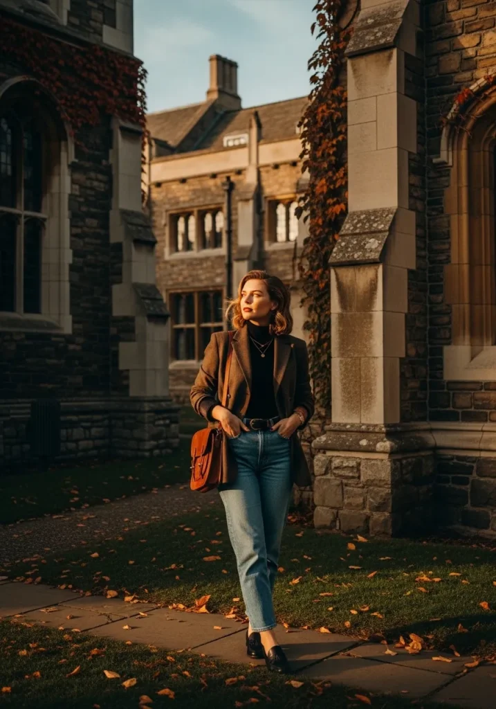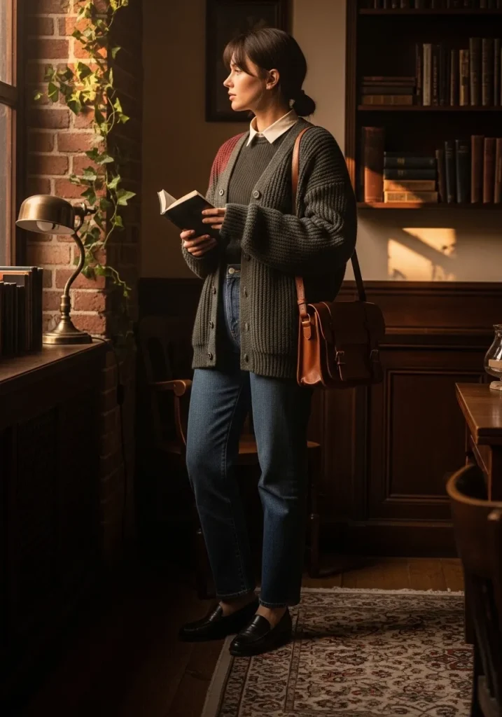 Style the outfit with loafers, oxford shoes, or low-heeled ankle boots to maintain that vintage-inspired mood. A leather belt and a structured satchel can help tie the whole look together without overwhelming it. This outfit is especially ideal for lectures, study sessions, or museum trips where you want something comfortable but still elevated. It feels smart, composed, and exactly like the kind of outfit you would imagine in a classic campus novel.