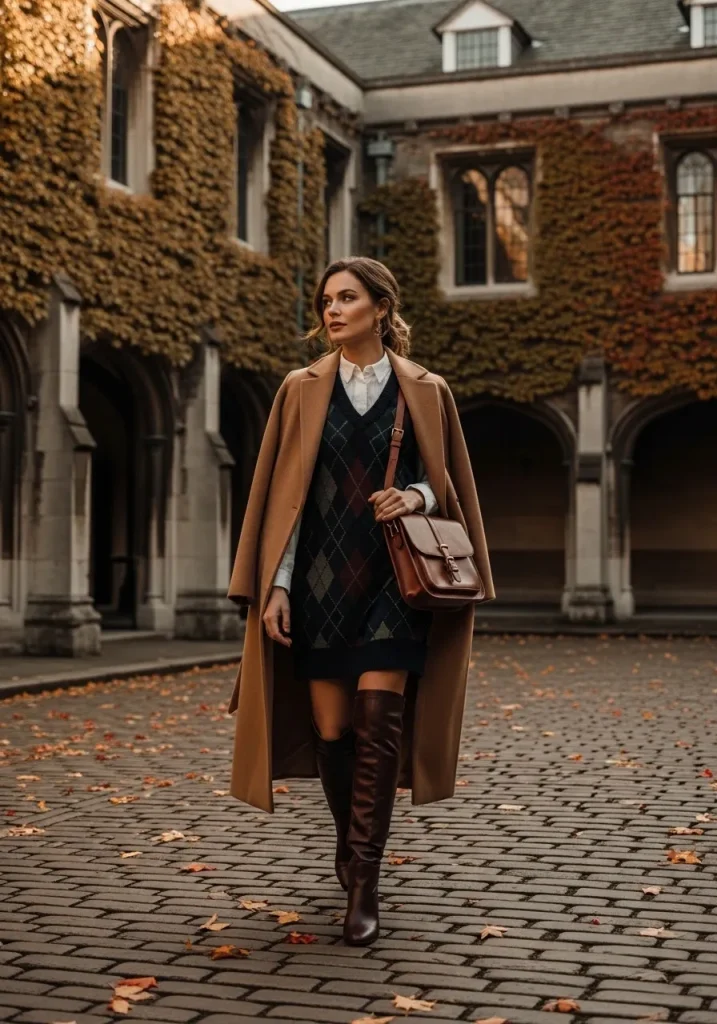 A camel coat layered over a sweater vest dress with tall boots creates a stylish dark academia outfit that feels both polished and cozy. The sweater vest dress gives the look a preppy academic base, while the camel coat adds sophistication and warmth. Tall boots make the outfit feel more complete and seasonally appropriate, especially for colder months. This combination works beautifully in neutral tones like camel, cream, black, and chocolate brown.