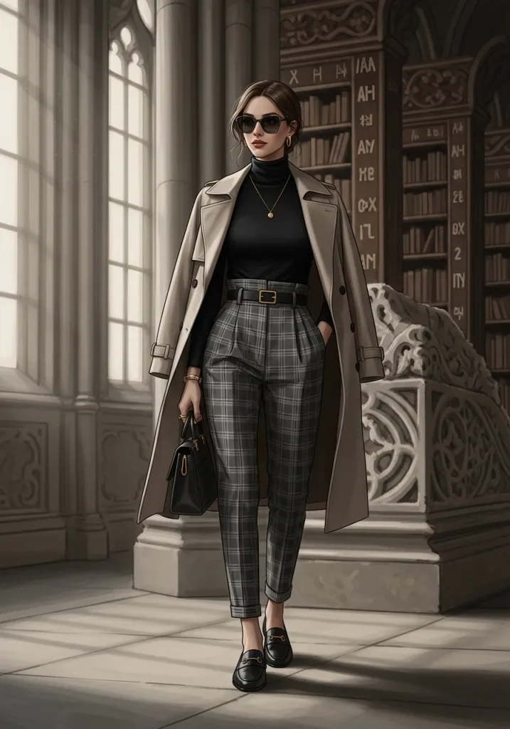 A black turtleneck with high-waisted plaid trousers is a sleek and versatile dark academia outfit that looks smart in almost any setting. The fitted turtleneck creates a clean silhouette, while the plaid pants introduce texture, pattern, and that unmistakable academic charm. Shades of gray, brown, black, and muted green work particularly well for this combination. The result is minimal, sharp, and ideal for those who prefer trousers over skirts.