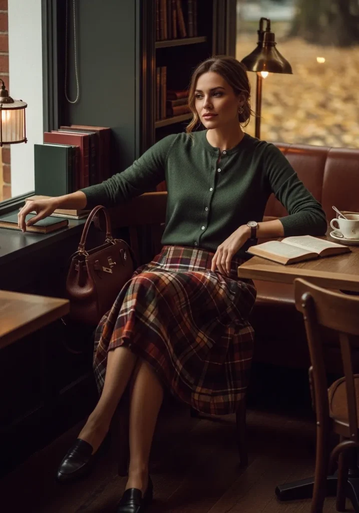 A buttoned cardigan tucked into a midi plaid skirt creates a classic dark academia outfit that feels soft, traditional, and very wearable. The cardigan adds warmth and a slightly romantic feel, while the plaid skirt brings in the signature academic pattern that instantly defines the look. Shades like brown, rust, black, beige, and muted green keep everything cohesive and true to the aesthetic. This outfit is ideal for anyone who loves old-fashioned elegance with a modern, practical twist.