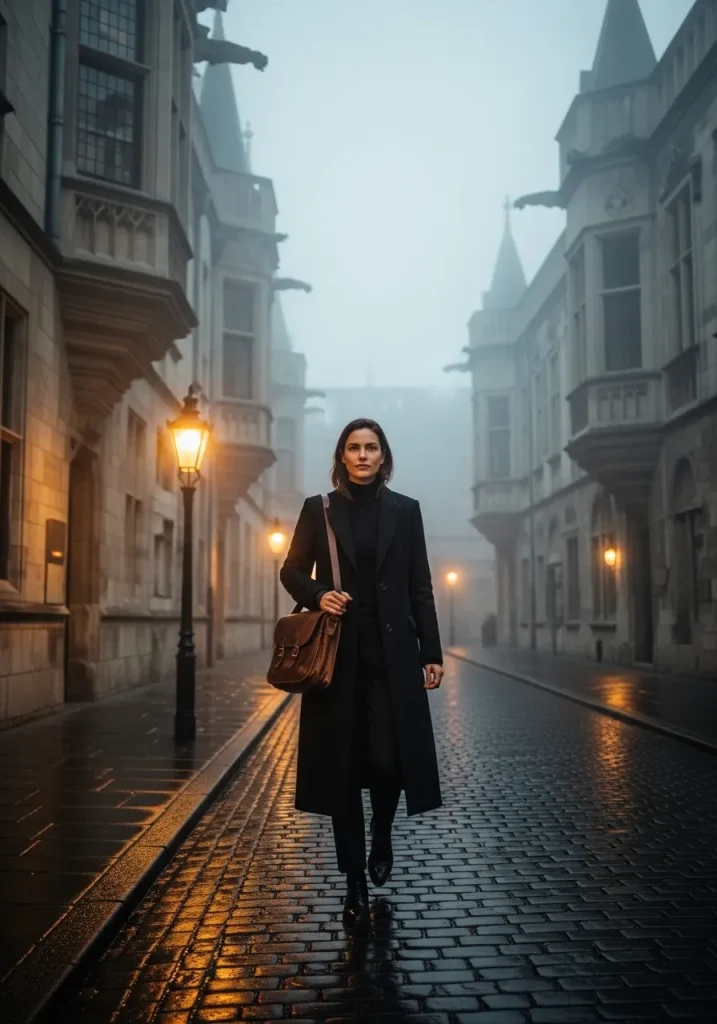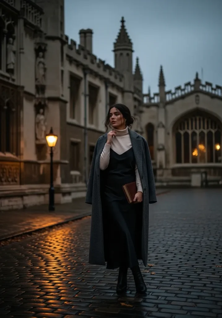 A double-breasted coat worn over tailored trousers with leather gloves gives you a dark academia outfit that feels powerful, refined, and incredibly timeless. The structured coat adds an air of confidence and old-world sophistication, while the trousers keep the outfit clean and streamlined. Dark shades like charcoal, black, espresso, and camel work especially well for creating a commanding academic silhouette. This is a look that feels right at home in winter city streets, university campuses, or elegant travel moments.