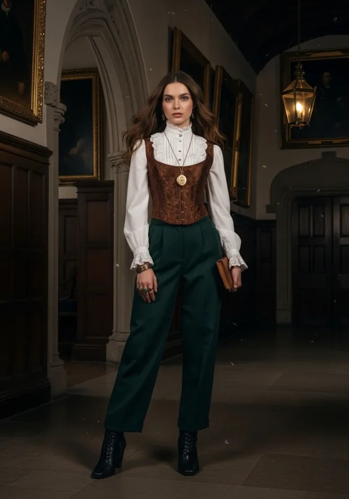 A white blouse paired with a corset-style vest and wide-leg trousers creates a dark academia outfit with a slightly dramatic and fashion-forward twist. The blouse keeps the look delicate and vintage-inspired, while the fitted vest adds shape and gives the outfit a romantic old-world feel. Wide-leg trousers balance the silhouette and make the whole outfit feel grounded, elegant, and wearable. Shades like black, brown, deep olive, and charcoal work beautifully for this look.