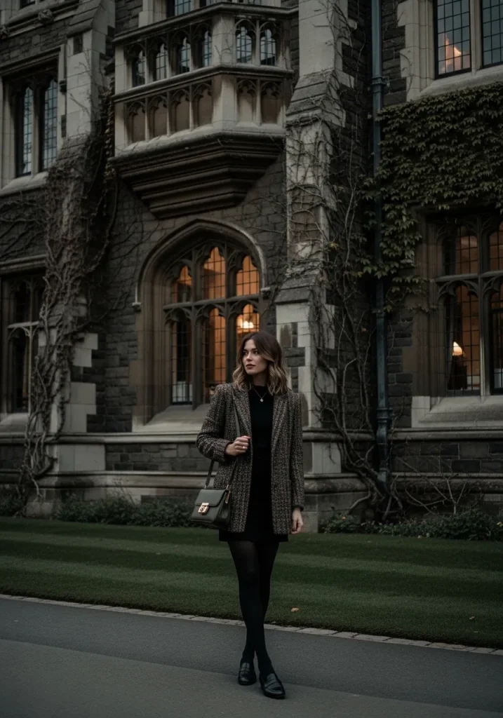 A tweed blazer layered over a black mini dress with tights is a chic dark academia outfit that feels polished, feminine, and slightly bold. The tweed fabric brings in that old-school scholarly texture, while the black mini dress creates a sleek and simple base underneath. Opaque tights help ground the look and make it more seasonally appropriate, especially for autumn and winter. This combination is a great choice when you want something dressier without leaving the academic aesthetic behind.