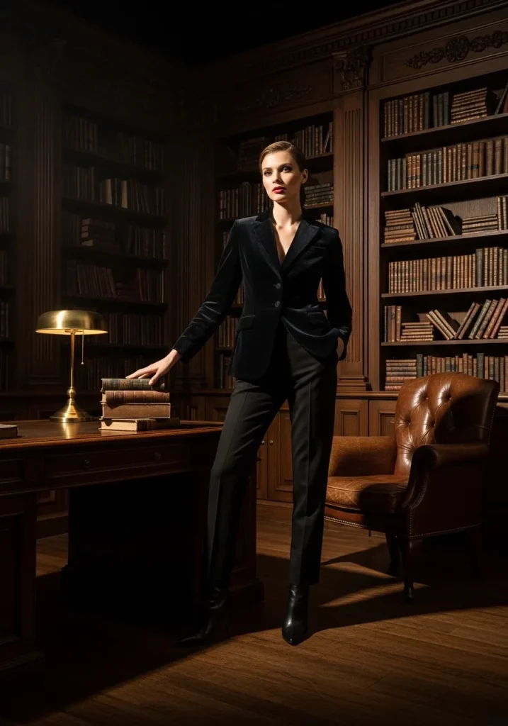 A velvet blazer with black trousers and heeled boots makes for a more elevated dark academia outfit that feels rich and slightly theatrical. The velvet texture instantly adds depth and old-world elegance, while the black trousers keep the outfit sleek and wearable. Deep jewel tones like burgundy, forest green, midnight blue, or classic black work beautifully for this look. It is an ideal outfit for evenings, dinners, or occasions where you want your dark academia style to feel a little more luxe.