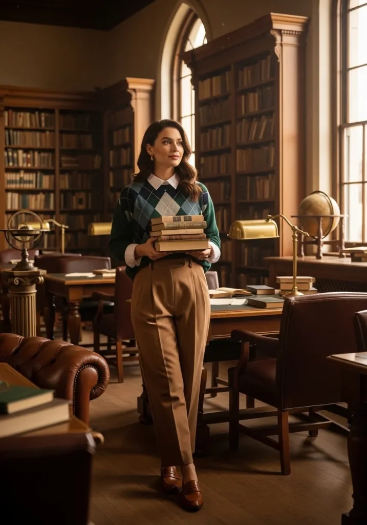 An argyle sweater paired with pleated trousers and loafers gives dark academia a vintage-prep feel that is both polished and cozy. The argyle pattern brings in texture and visual interest, while the pleated trousers add structure and maturity to the overall outfit. Colors like brown, beige, dark green, navy, and gray work especially well to create that old-university mood. It is a charming look that feels both intellectual and approachable.