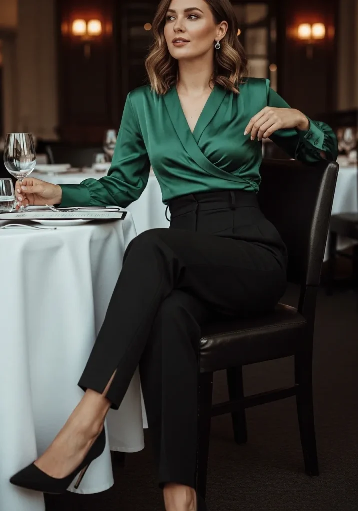 A wrap top paired with tailored trousers creates a sophisticated date night outfit that balances elegance with comfort. The wrap design highlights the waist and creates a flattering shape, while the trousers add structure and polish.