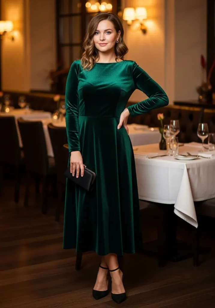 Choose velvet dresses in deep colors like emerald, burgundy, or navy to enhance the romantic mood. Pair the outfit with elegant heels and a small clutch to keep the look polished. Minimal jewelry works best so the fabric remains the focus.