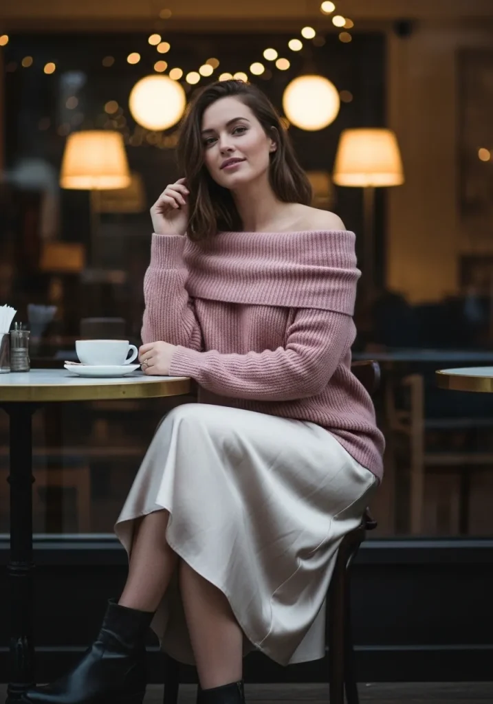 An off-shoulder sweater paired with a midi skirt creates a romantic outfit that feels cozy yet effortlessly stylish. The off-shoulder neckline adds a subtle touch of elegance while still keeping the look relaxed and comfortable for a casual dinner or evening walk.