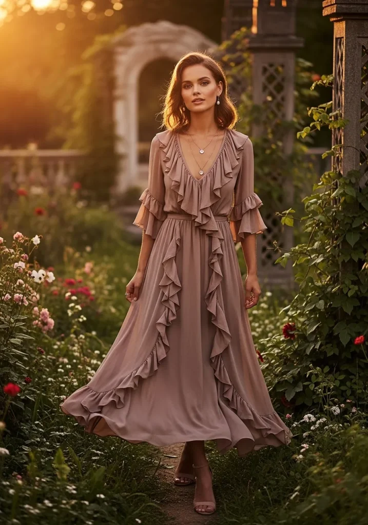 Choose dresses in flowy fabrics like chiffon or soft cotton so the ruffles move gracefully as you walk. Soft pastel shades or floral patterns enhance the romantic vibe of the outfit. Pair the dress with delicate jewelry such as thin bracelets or small earrings to maintain a balanced and elegant look.