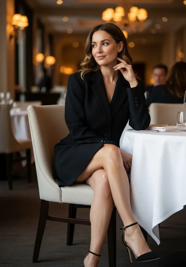 A blazer dress creates a modern and confident date night look that still feels feminine and stylish. The structured shape of the blazer dress adds sophistication while the shorter length keeps the outfit playful and romantic. It’s a perfect outfit for stylish dinners or evening events.