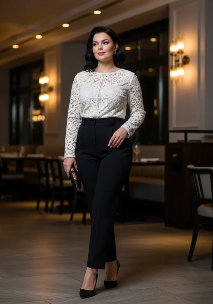 Choose lace tops in soft shades like ivory, black, or blush to keep the outfit romantic and refined. High-waisted trousers in neutral tones like black, beige, or charcoal help create a flattering silhouette. Finish the outfit with pointed heels and a sleek clutch to create a date night look that feels stylish yet elegant.
