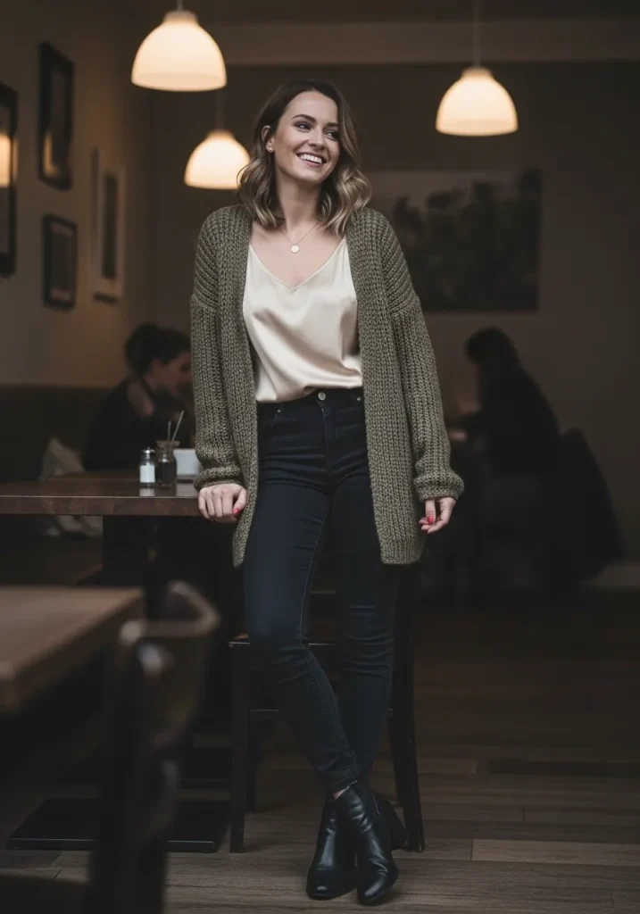 Choose dark wash jeans to keep the look polished and slightly dressy. A neutral cardigan in shades like cream or camel adds warmth without overpowering the outfit. Complete the look with heeled ankle boots or pointed flats to create a romantic yet casual date night style.