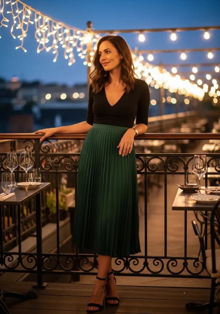 A pleated midi skirt paired with a fitted top creates a romantic date night outfit that feels both graceful and stylish. The pleats add beautiful movement while the fitted top balances the volume of the skirt to create a flattering silhouette.