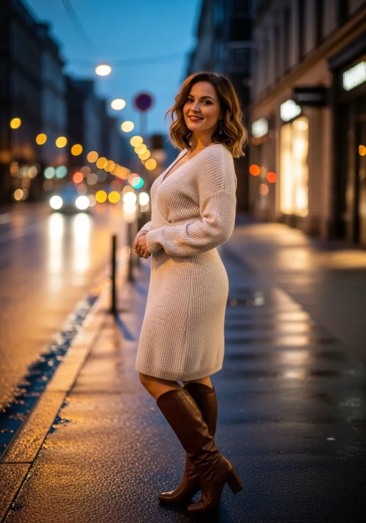 A knit dress paired with knee-high boots creates a cozy yet romantic outfit that works beautifully during cooler seasons. The soft knit fabric feels comfortable while still hugging the silhouette in a flattering way.