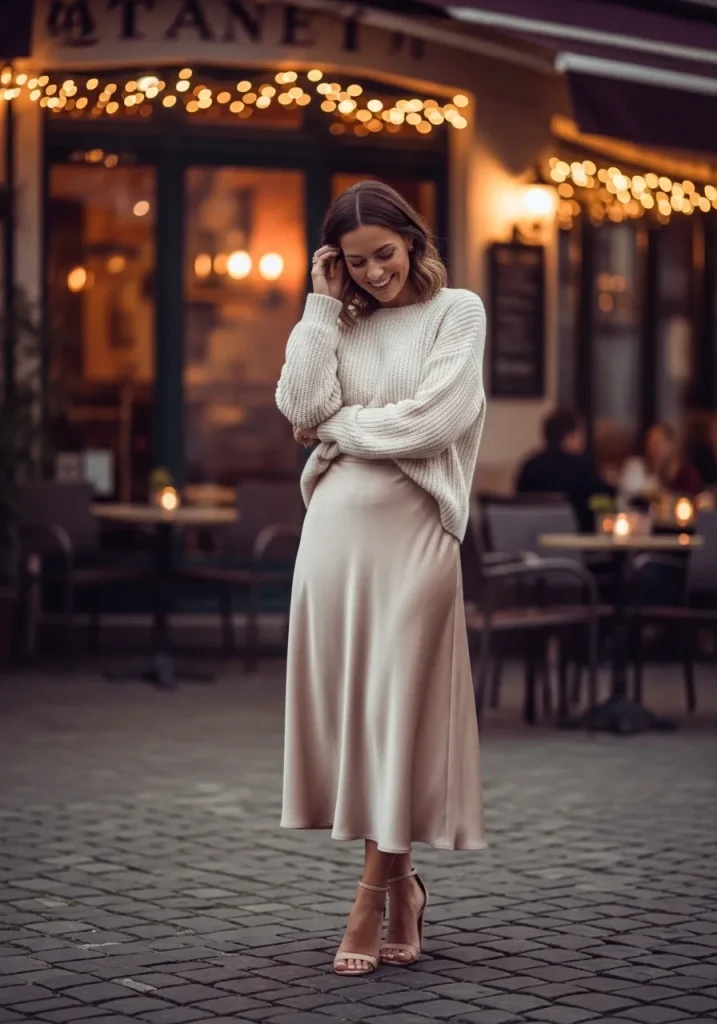 A satin skirt paired with a soft sweater creates a romantic outfit that feels cozy yet elegant. The shiny texture of the satin contrasts beautifully with the soft knit of the sweater, creating a balanced and stylish look.