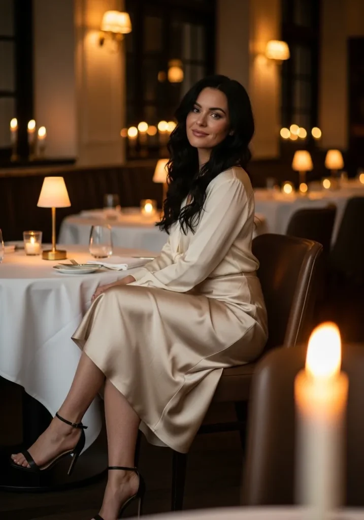 Pair the slip dress with delicate strappy heels to elongate the silhouette and add a graceful finishing touch. A small clutch and subtle jewelry like gold hoop earrings or a delicate pendant necklace complete the look without overpowering the elegance of the dress. This outfit is perfect for candlelit dinners or evening restaurant dates where you want to feel polished yet romantic.