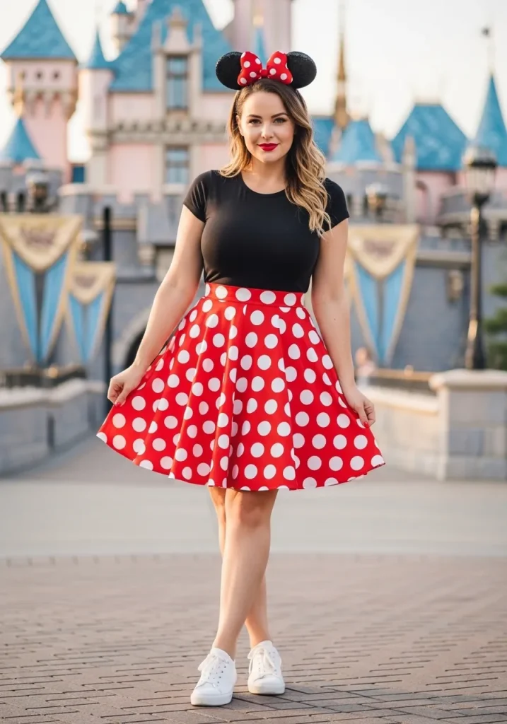 You can pair a polka dot skirt with a black fitted top and comfortable sneakers for walking all day. Adding Minnie ears and a small crossbody bag completes the outfit perfectly. Keeping accessories simple ensures the outfit remains practical. This look works well for all ages and styles. It’s perfect for photos, rides, and exploring the park.