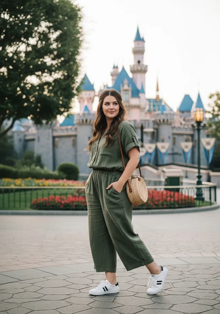A jumpsuit paired with sneakers creates a stylish and easy Disneyland outfit. The one-piece design makes it effortless to wear while still looking put together. This outfit feels modern and practical. It’s perfect for long days at the park. The overall look is clean and comfortable.