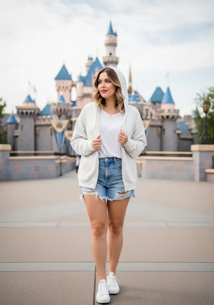 A lightweight hoodie paired with shorts creates a cozy yet breathable Disneyland outfit that works perfectly for unpredictable weather. Mornings and evenings at the park can feel cooler, so layering with a hoodie keeps you comfortable without overheating. The relaxed fit adds to the casual, laid-back vibe that suits a theme park setting. This combination feels practical while still looking stylish. It’s the kind of outfit you can wear all day without feeling restricted.
