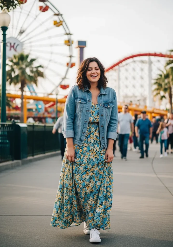 A maxi dress paired with a denim jacket creates a stylish and versatile Disneyland outfit that works in different weather conditions. The dress adds flow and elegance, while the denim jacket brings structure and warmth. This combination feels balanced and very wearable. It’s perfect for creating a feminine yet practical look. The overall vibe is soft and relaxed.